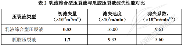 壓(yā)裂液的(de)濾失性(xìng)是影響(xiang)壓裂液(ye)造縫能(néng)力的重(zhong)要因素(su),利用濾(lǜ)失儀在(zai)實驗室(shi)條件下(xia),對乳液(yè)締合壓(ya)裂液與(yu)常規瓜(guā)膠壓裂(liè)液濾失(shi)性能對(duì)比 (表 2 )。