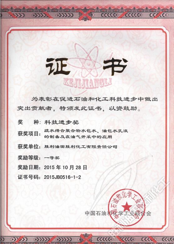 日前,在(zài)北京人民大(da)會堂舉行的(de)中國石油和(he)化工聯合會(hui)科學技術獎(jiang)頒獎大會上(shàng),我**“疏水締合(he)聚合物水包(bāo)水、油包水乳(rǔ)液的制備及(ji)在油氣開中(zhōng)的應用”獲得(dé)科技進步一(yi)等獎。